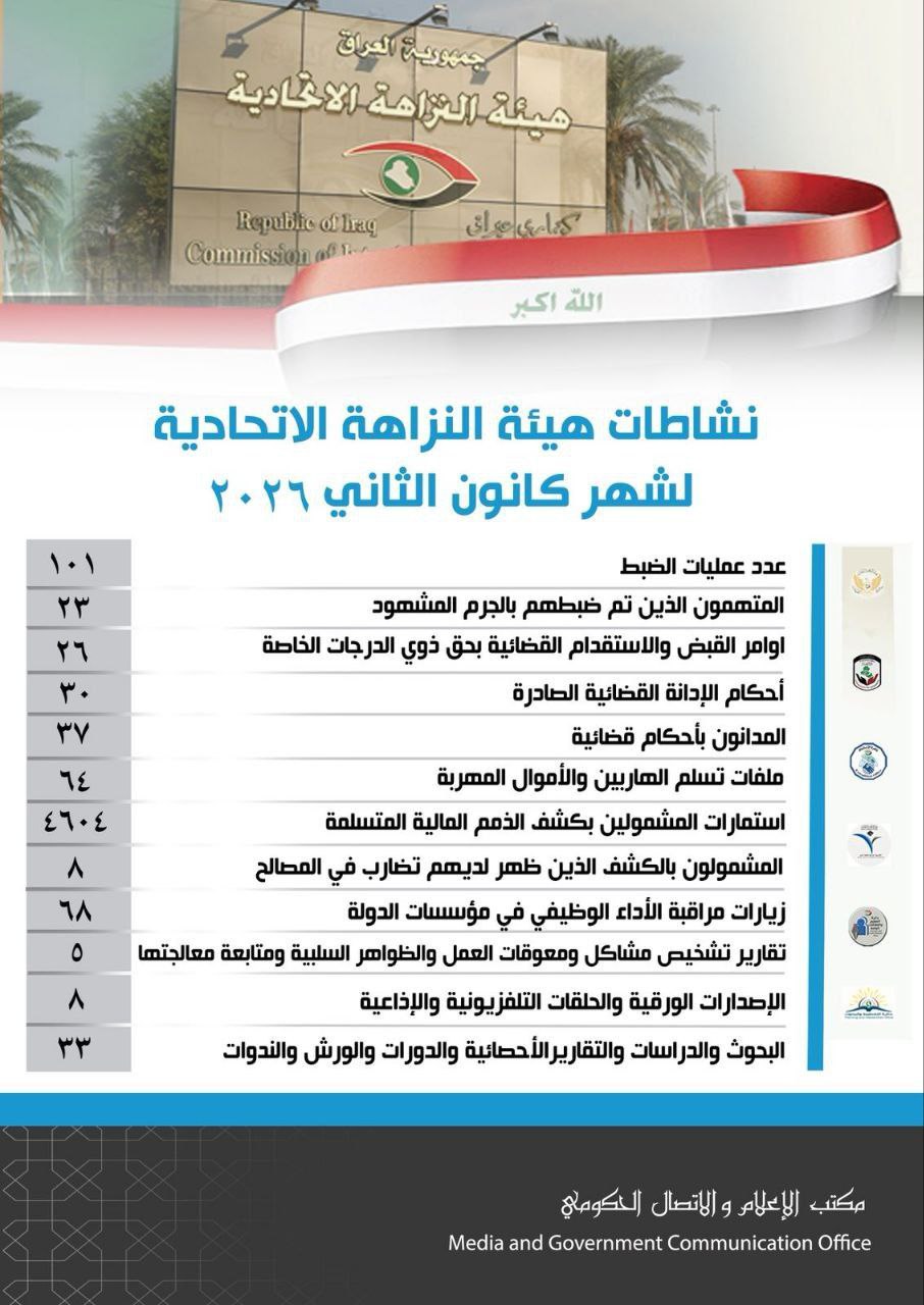 Uncategorized النزاهة: 26 أمر قبض واستقدام بحق ذوي الدرجات الخاصة خلال كانون الثاني الماضي . By علي حيدر - فبراير 3, 2026 0 6 Homepage أثر_news